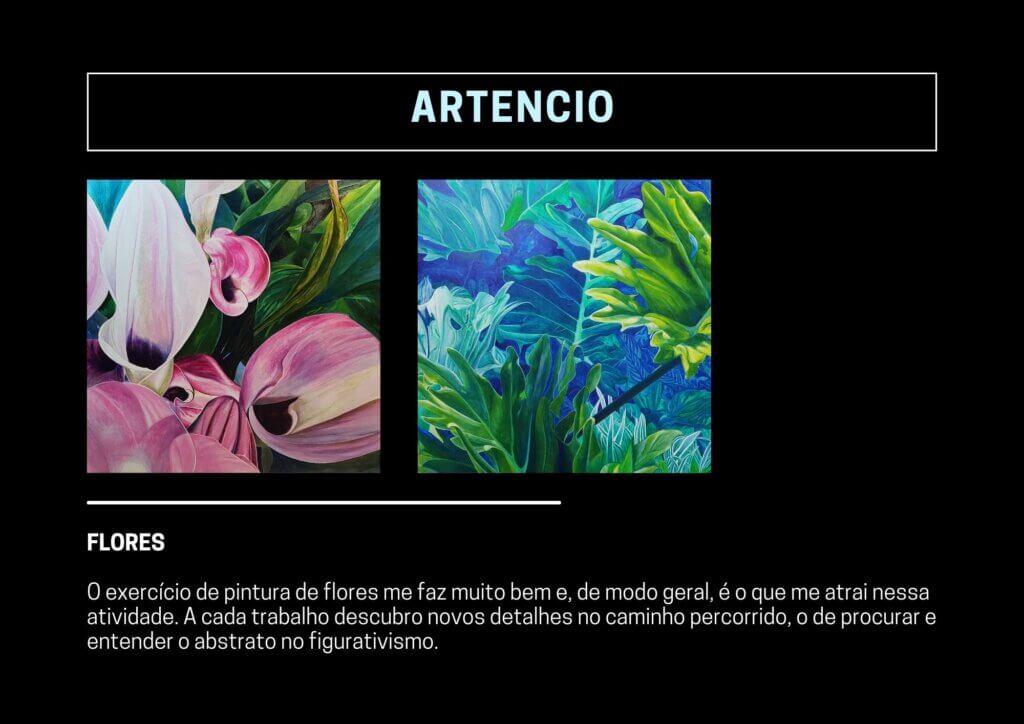 O exercício de pintura de flores me faz muito bem e, de modo geral, é o que me atrai nessa atividade. A cada trabalho descubro novos detalhes no caminho percorrido, o de procurar e entender o abstrato no figurativismo.