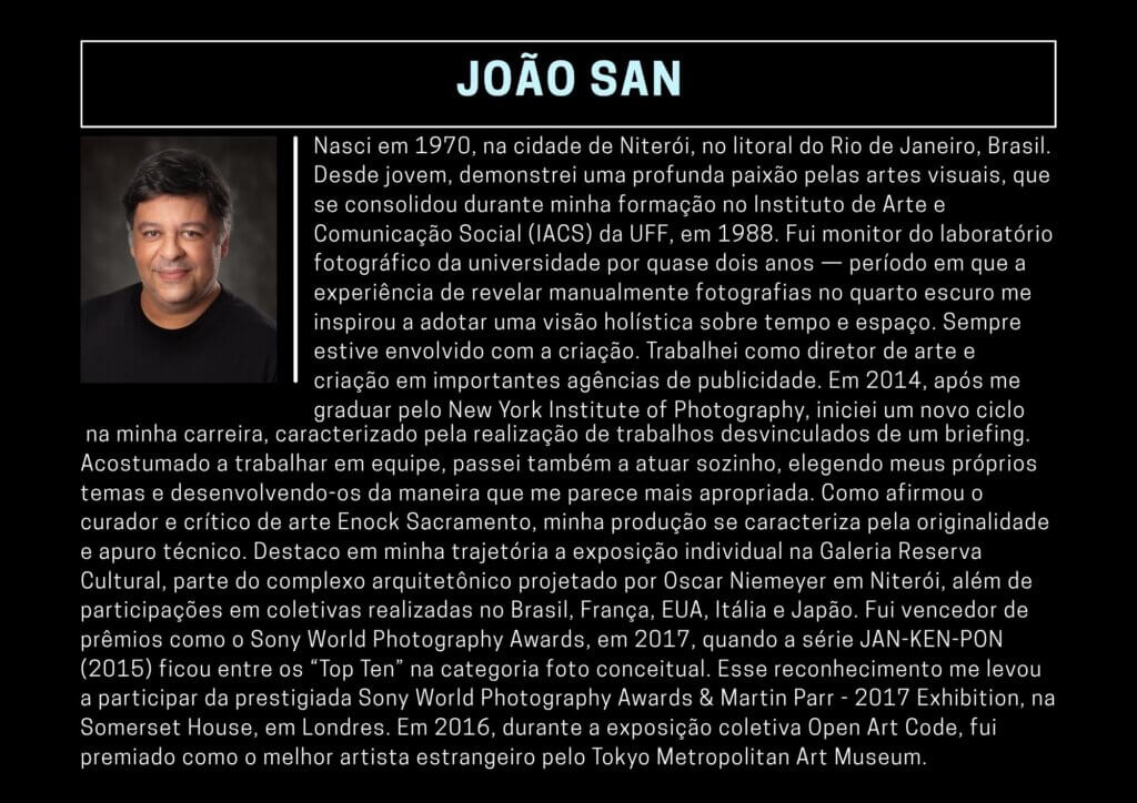 Fui vencedor de prêmios como o Sony World Photography Awards, em 2017, quando a série JAN-KEN-PON (2015) ficou entre os “Top Ten” na categoria foto conceitual. Esse reconhecimento me levou a participar da prestigiada Sony World Photography Awards & Martin Parr – 2017 Exhibition, na Somerset House, em Londres. Em 2016, durante a exposição coletiva Open Art Code, fui premiado como o melhor artista estrangeiro pelo Tokyo Metropolitan Art Museum.