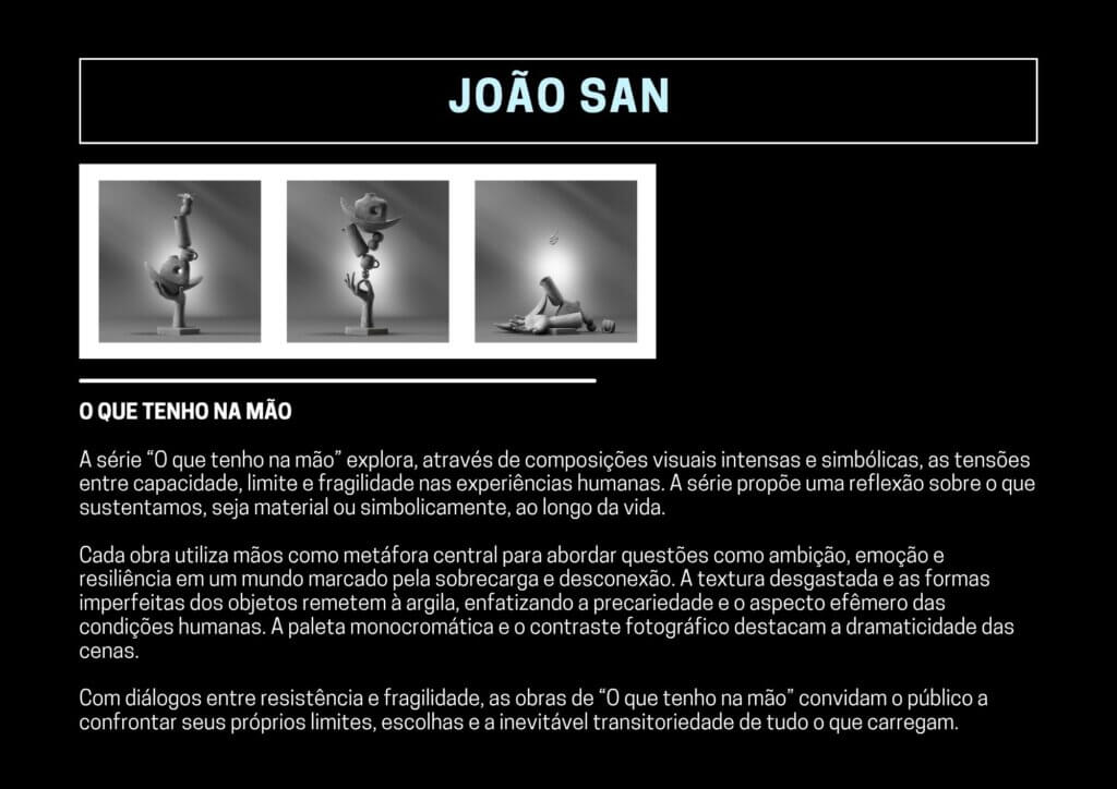 A série “O que tenho na mão” explora, através de composições visuais intensas e simbólicas, as tensões entre capacidade, limite e fragilidade nas experiências humanas. A série propõe uma reflexão sobre o que sustentamos, seja material ou simbolicamente, ao longo da vida.