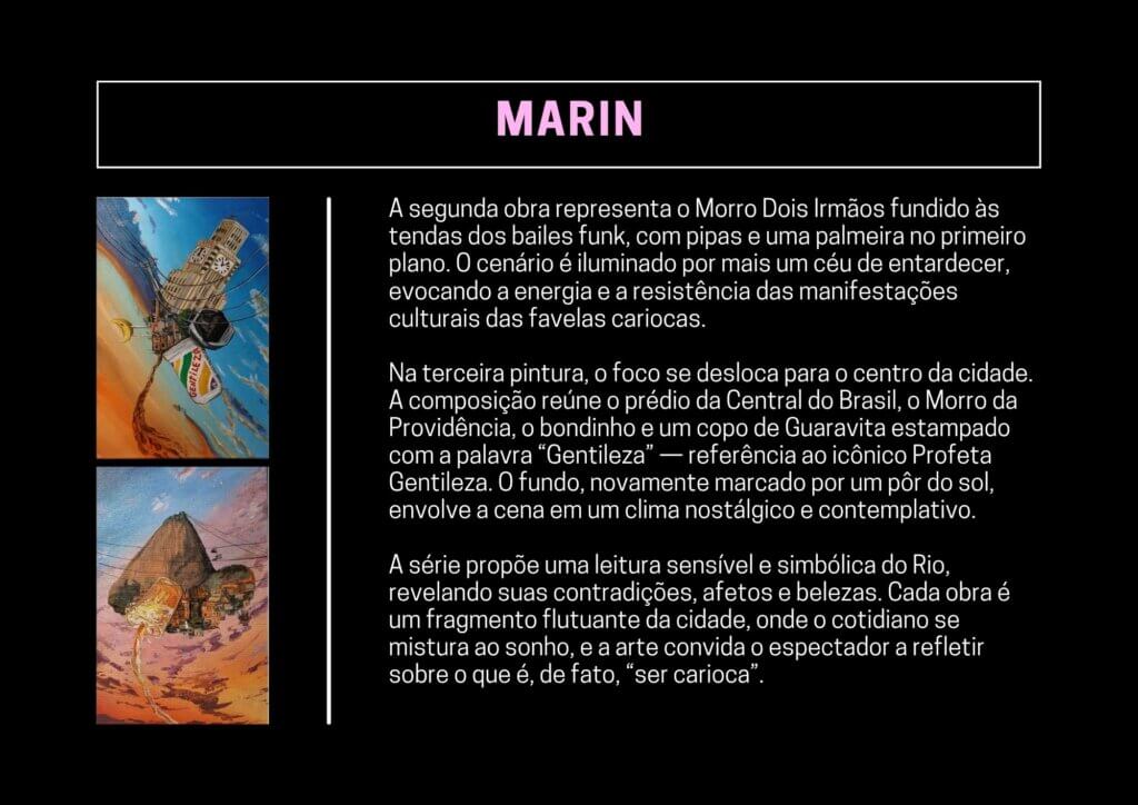 A série propõe uma leitura sensível e simbólica do Rio, revelando suas contradições, afetos e belezas. Cada obra é um fragmento flutuante da cidade, onde o cotidiano se mistura ao sonho, e a arte convida o espectador a refletir sobre o que é, de fato, “ser carioca”.
