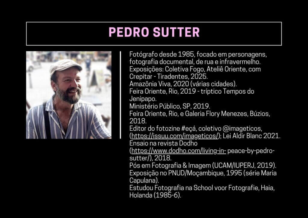 Fotógrafo desde 1985, focado em personagens, fotografia documental, de rua e infravermelho. Exposições: Coletiva Fogo, Ateliê Oriente, com Crepitar – Tiradentes, 2025.