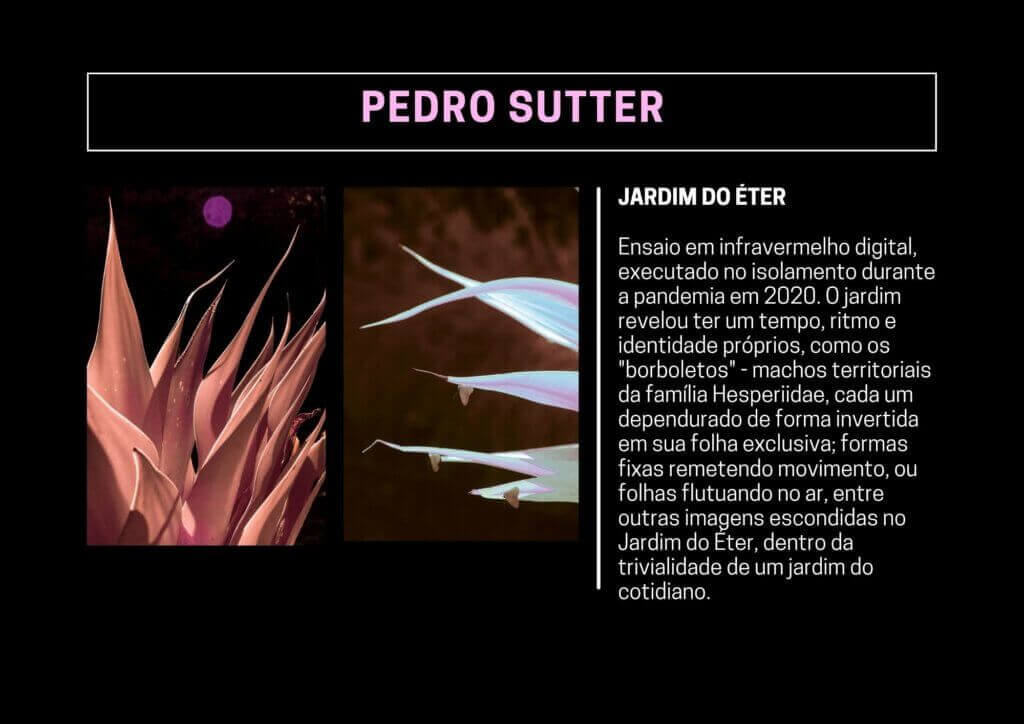 Ensaio em infravermelho digital, executado no isolamento durante a pandemia em 2020. O jardim revelou ter um tempo, ritmo e identidade próprios, como os “borboletos” – machos territoriais da família Hesperiidae, cada um dependurado de forma invertida em sua folha exclusiva; formas fixas remetendo movimento, ou folhas flutuando no ar, entre outras imagens escondidas no Jardim do Éter, dentro da trivialidade de um jardim do cotidiano.