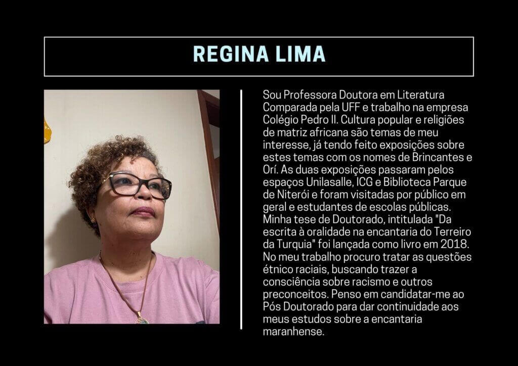 Sou Professora Doutora em Literatura Comparada pela UFF e trabalho na empresa Colégio Pedro II. Cultura popular e religiões de matriz africana são temas de meu interesse, já tendo feito exposições sobre estes temas com os nomes de Brincantes e Orí. As duas exposições passaram pelos espaços Unilasalle, ICG e Biblioteca Parque de Niterói e foram visitadas por público em geral e estudantes de escolas públicas. Minha tese de Doutorado, intitulada “Da escrita à oralidade na encantaria do Terreiro da Turquia” foi lançada como livro em 2018. No meu trabalho procuro tratar as questões étnico raciais, buscando trazer a consciência sobre racismo e outros preconceitos. Penso em candidatar-me ao Pós Doutorado para dar continuidade aos meus estudos sobre a encantaria maranhense.