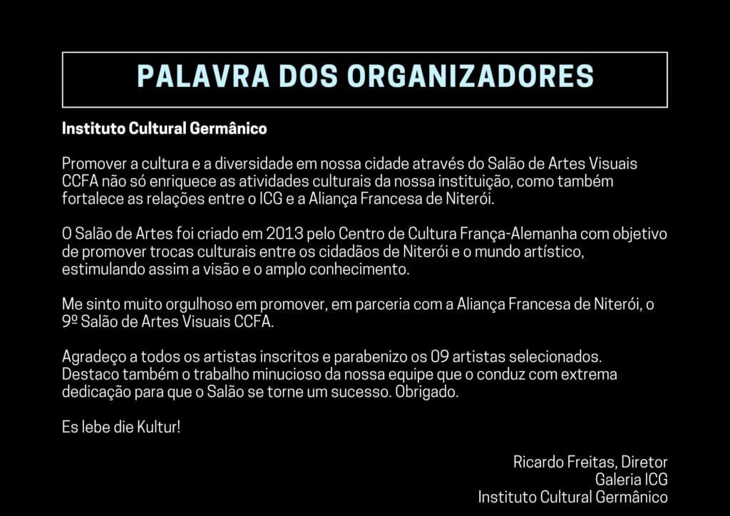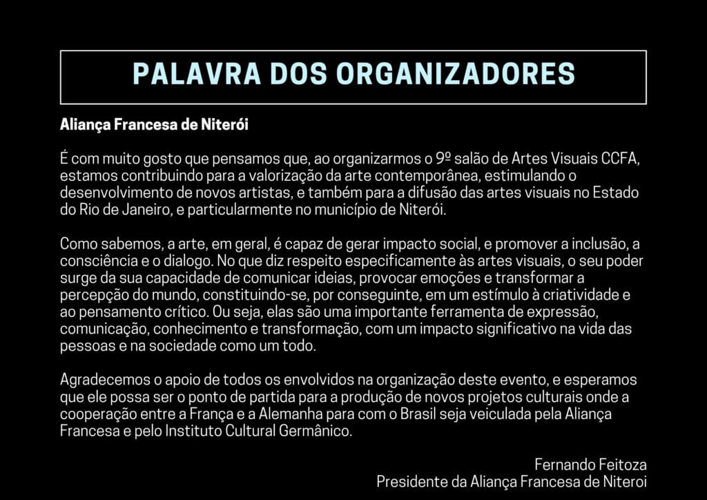 A Aliança Francesa de Niterói e o Instituto Cultural Germânico têm o prazer de anunciar o 9º Salão de Artes Visuais CCFA, um concurso que celebra e valoriza a produção artística!