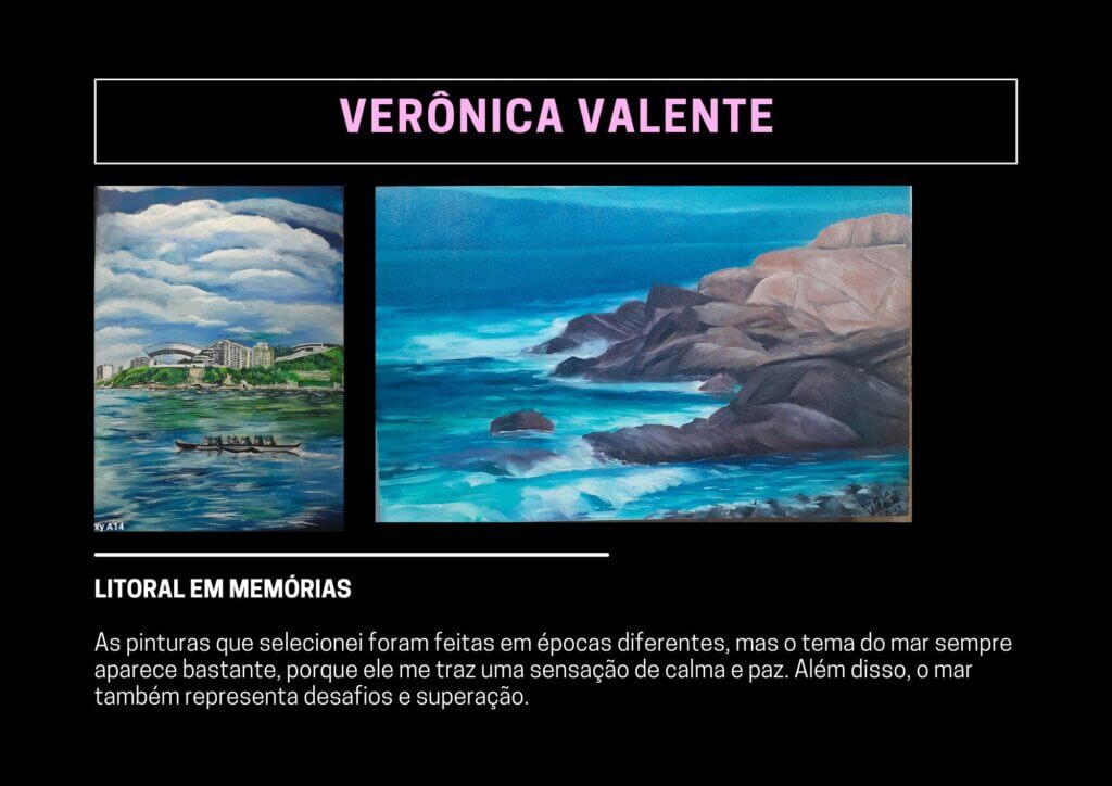 As pinturas que selecionei foram feitas em épocas diferentes, mas o tema do mar sempre aparece bastante, porque ele me traz uma sensação de calma e paz. Além disso, o mar também representa desafios e superação.