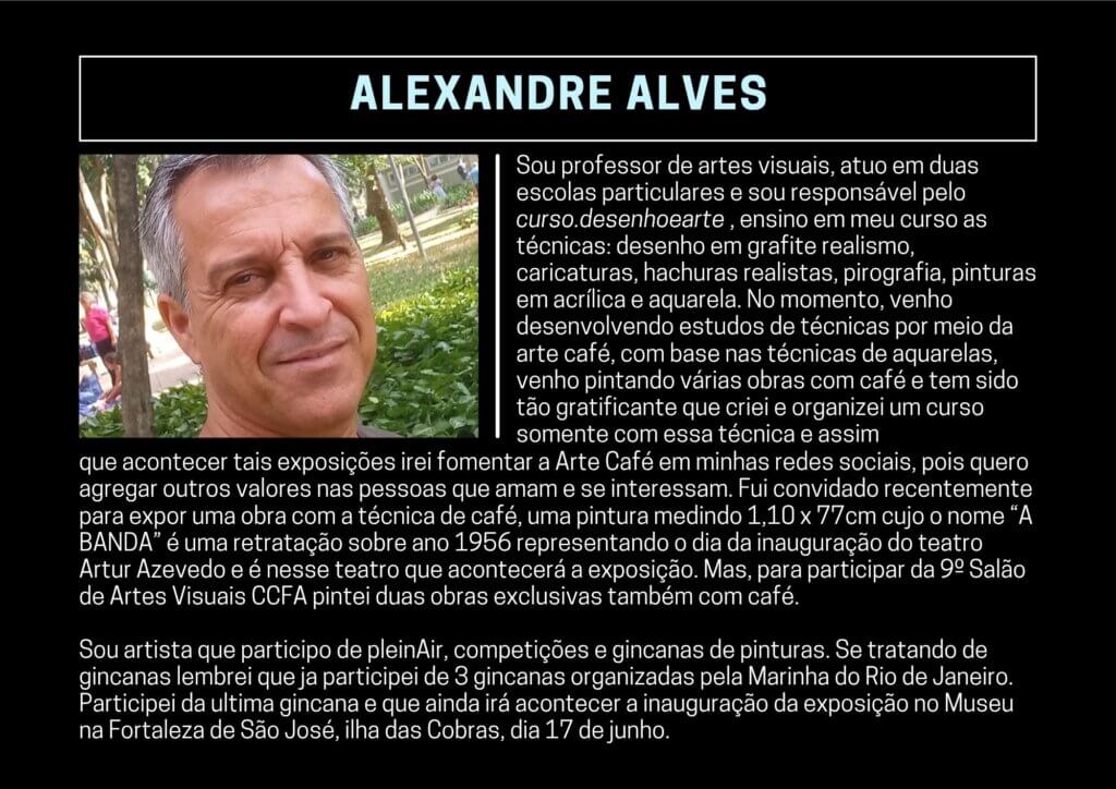 Sou professor de artes visuais, atuo em duas escolas particulares e sou responsável pelo curso.desenhoearte , ensino em meu curso as técnicas: desenho em grafite realismo, caricaturas, hachuras realista, pirografia, pinturas em acrílica e aquarela. no momento venho desenvolvendo estudos de técnicas por meio da arte café, base nas técnicas de aquarelas, venho pintando várias obras com café e tem sido tão gratificante que criei e organizei um curso somente com essa técnica e assim que acontecer tais exposições irei fomentar a Arte Café em minhas redes sociais, pôs quero agregar outros valores nas pessoas que amam e se interessam. Fui convidado recentemente para expor uma obra com a técnica de café, uma pintura medindo 1,10 x 77cm cujo o nome A BANDA é uma retratação sobre ano 1956 representando o dia da inauguração do teatro Artur Azevedo e é nesse teatro que acontecerá a exposição. Mas, para participar da 9º Salão de Artes Visuais CCFA pinturas duas obras exclusivas, foi pintada também com café.